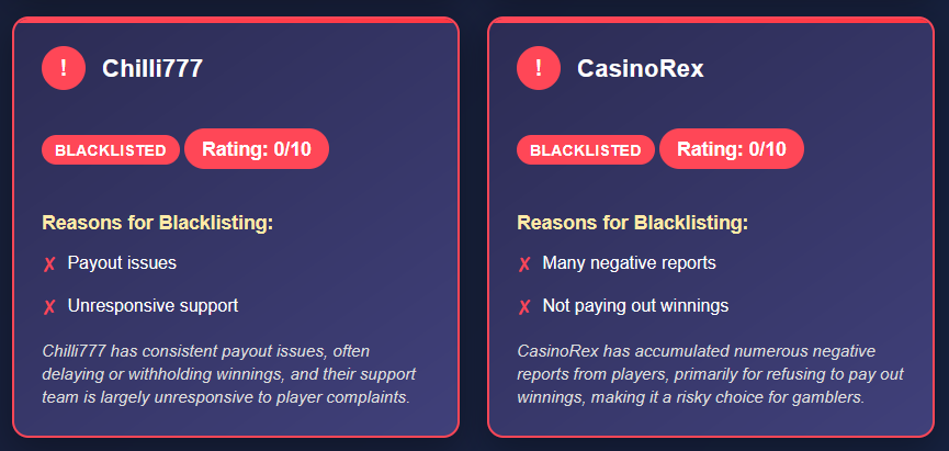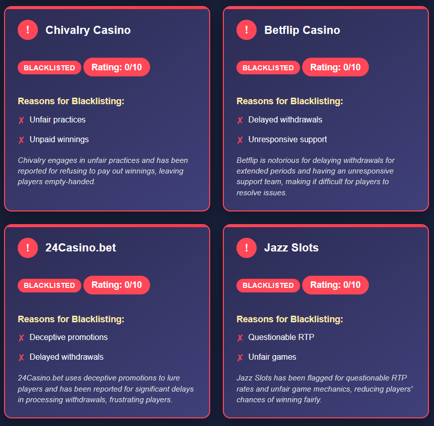 To illustrate the risks, here are detailed examples of casinos that have been blacklisted, along with the reasons for their inclusion. Each has been rated 0/10, signaling serious concerns for players: