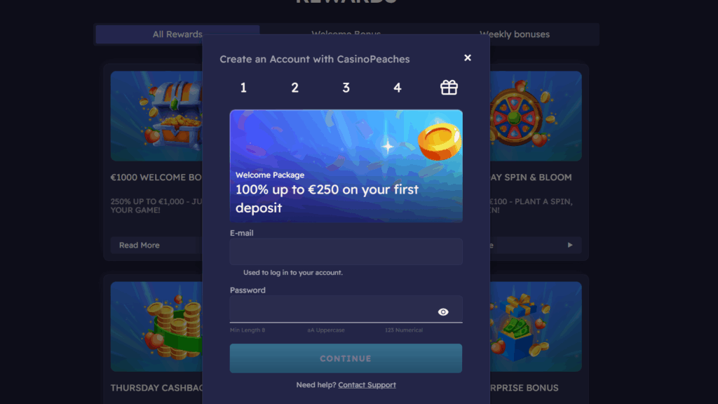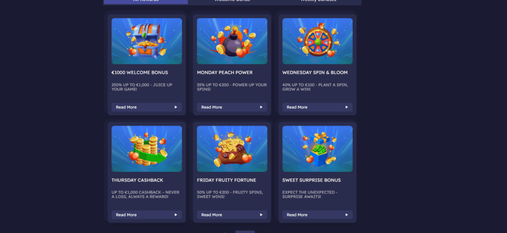 The minimum deposit is €20, with wagering requirements reportedly set at 40x, though the official terms lack clarity on specific conditions. Notably, general terms (section 8.1.1) state that bonus funds cannot be withdrawn, which significantly diminishes their value. No no-deposit bonus is currently available. Players can view active promotions in their account dashboard on the official website (casinopeaches.com), where a screenshot of the “Rewards” section would display these offers, though not provided here.