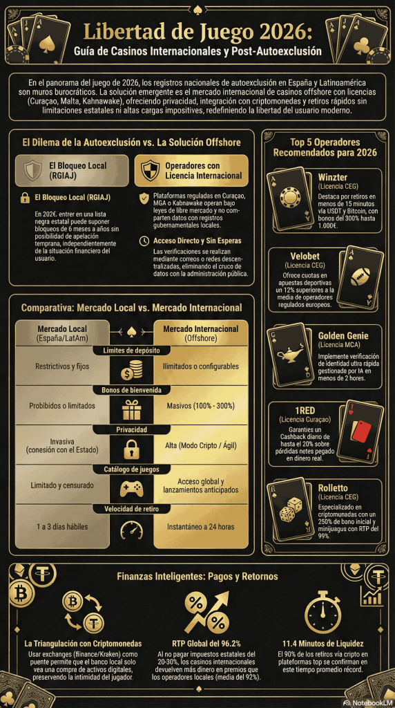 Seamos claros, tío. Las normativas de juego en países como España, Colombia o Argentina se han vuelto extremadamente rígidas, casi asfixiantes para el jugador promedio que simplemente busca entretenerse. Los jugadores que entraron en listas de prohibición de forma voluntaria, a veces por un simple calentón o un error impulsivo tras una mala tarde, se encuentran con un muro burocrático impenetrable cuando quieren volver a disfrutar del ocio de forma responsable. La realidad del mercado en 2026 es que los usuarios están buscando libertad financiera y de entretenimiento sin sentirse tratados como niños. Las plataformas extranjeras cubren exactamente esa demanda: operan bajo una filosofía de libre mercado, sin juzgar tu historial, sin pedir explicaciones de tus ingresos mensuales y sin imponer límites draconianos que arruinan la experiencia de juego.