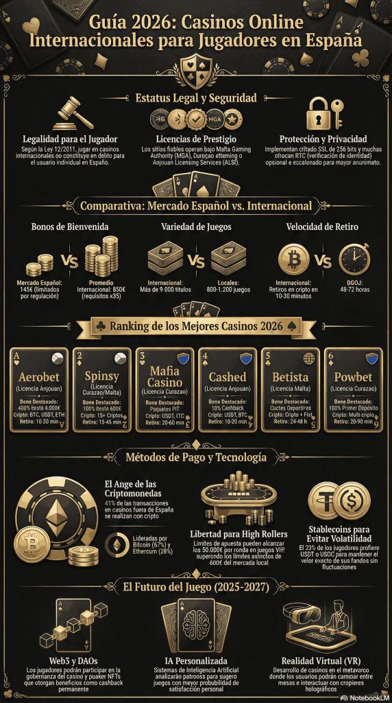 Los casinos online fuera de España son plataformas de juego que operan bajo licencias internacionales (Curazao, Malta MGA, Anjouan) sin autorización de la Dirección General de Ordenación del Juego (DGOJ). Aunque estos operadores no pueden publicitarse legalmente en territorio español, jugar en ellos no constituye delito para el usuario individual según la Ley 13/2011 de regulación del juego.