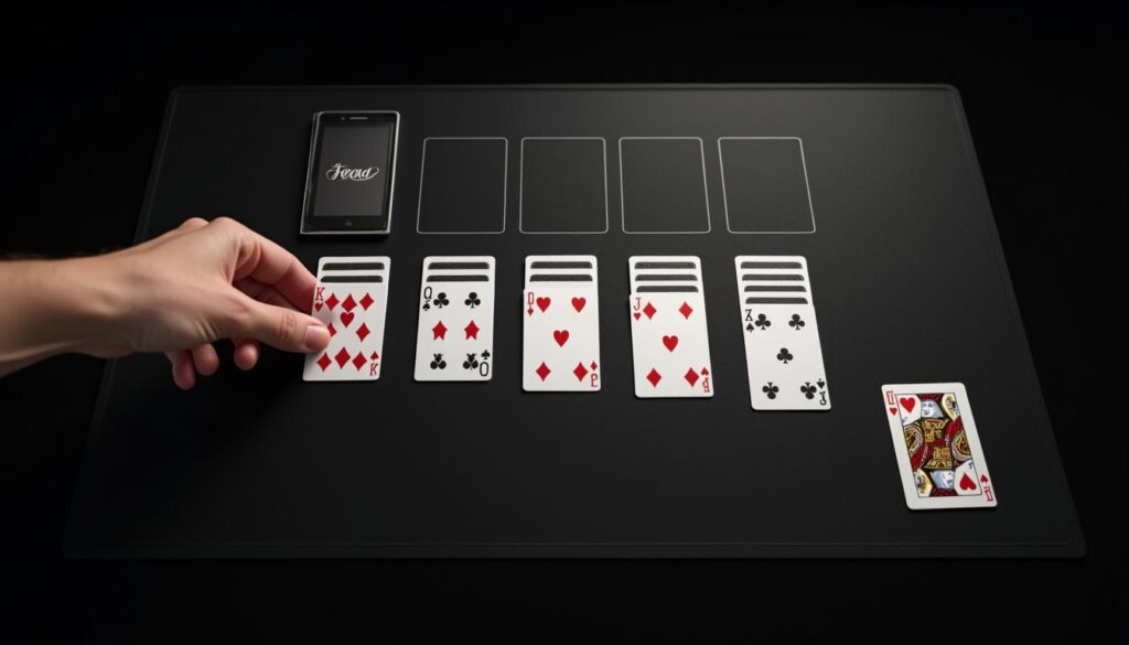 The remaining 24 cards form the stock pile, placed face down to the side. Nearby, reserve space for the waste pile (where you’ll turn over stock cards) and the four foundations (empty at the start). In physical play, common in British homes before the digital boom, you’d use a table about 1 metre wide to avoid overlap— a subtle ergonomic consideration that enhances focus.